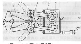 剪切臂相當(dāng)于一個(gè)單自由度回轉(zhuǎn)坐標(biāo)形擺動(dòng)機(jī)械手,其工作原理如圖3所示。裝有軸承的兩個(gè)剪切臂1安裝在主軸2上下兩部分,主軸組件固定在圖9-2中的安裝架4上,主軸上部通過(guò)支架裝在復(fù)合安裝板上,圓柱向心推力滾子軸承承受剪切臂部件的軸向載荷并使剪切臂擺動(dòng)自由。曲柄連桿機(jī)構(gòu)3帶動(dòng)剪切壁擺動(dòng),轉(zhuǎn)動(dòng)力矩來(lái)自傳動(dòng)箱4。傳動(dòng)箱安裝在機(jī)身軸的安裝架上,箱內(nèi)有兩根軸,主動(dòng)軸下端通過(guò)聯(lián)軸器與液壓馬達(dá)相連,主動(dòng)軸上端與曲柄相連。主動(dòng)軸通過(guò)一對(duì)相互嚙合的直齒輪將運(yùn)動(dòng)傳遞給從動(dòng)軸上端部的另一個(gè)剪切臂。液壓馬達(dá)轉(zhuǎn)動(dòng)時(shí),便可完成一對(duì)剪切臂的擺動(dòng)。剪切臂末端固定著兩把剪切刀片,當(dāng)兩個(gè)剪切臂協(xié)動(dòng)時(shí),即可將黏性液流剪切成料滴。