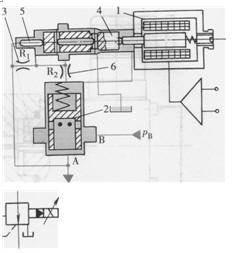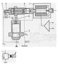 i-比例電磁鐵2-主閥心3、6-不可調(diào)節(jié)流閥4-先導閥心5一壓力反饋推桿