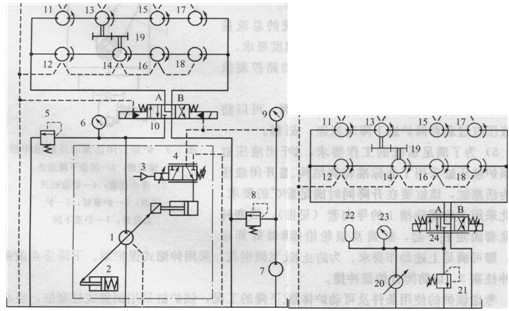 1-比例變量液壓泵;2-變量缸;3-比例控制器;4-比例閥;5、8、21-溢流閥; 6、9、23-壓力表;7-控制液壓泵;10 -三位四通電液換向閥;11~18 -雙向定量液壓馬達;19-齒輪;20-恒壓變量液壓泵;22-蓄能器;24-電液比例方向閥