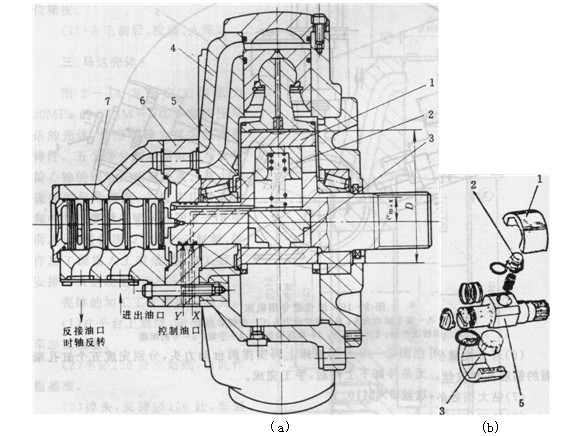 圖1所示的軸配流變量馬達(dá)的基本結(jié)構(gòu)與定量馬達(dá)相同。不同之處是它的偏心值可以改變。為了實(shí)現(xiàn)這一目的,在集流器7和星形缸體4之間加進(jìn)一個(gè)設(shè)有控制油口的隔套6,控制油從隔套經(jīng)集流器引進(jìn)曲軸5。曲軸上的偏心環(huán)1也不再與曲軸制成一體,而是做成分離的。偏心環(huán)中央是一條兩側(cè)平行的長(zhǎng)槽,與方滑塊兩側(cè)面相配。方滑塊與馬達(dá)的輸出軸做成一體。方滑塊的另外兩面相對(duì)裝有大、小活塞3和2,在長(zhǎng)槽里支撐著偏心環(huán)。大、小活塞腔分別與曲軸里的控制油路相連。當(dāng)Y口進(jìn)控制油(即小活塞腔進(jìn)油、大活塞腔回油)時(shí),小活塞在壓力油的作用下將偏心環(huán)1向最大偏心方向推動(dòng)。當(dāng)X口進(jìn)控制油(即小活塞腔回油、大活塞腔進(jìn)油)時(shí),偏心環(huán)便向最小偏心方向推動(dòng)。這樣就構(gòu)成了復(fù)式排量馬達(dá)。