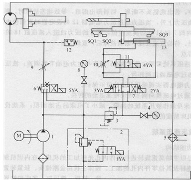 1一吸油過濾器;2定量齒輪泵;3壓力表及其開關(guān);4溢流閥;5-高壓精過濾器; 6、7、8-二位四通電磁換向閥;9-三位四通電磁換向閥;l0-二位三通電磁換向閥;