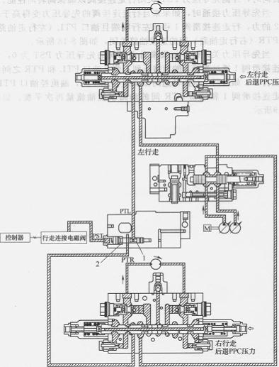 當(dāng)先導(dǎo)壓力接通時(shí),如果來(lái)自行走連接閥的先導(dǎo)壓力變得高于彈簧2的力,行走連接滑閥1移到左行程端且油口PTL(左行走油路)和PTR(右行走油路)間的連接油路關(guān)閉,如圖8-18所示。