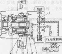 ①開始行走時[圖]。操作行走操縱桿時,來自泵的壓力油啟動平衡閥(背壓閥)的滑閥1,打開到停車制動器的油路,并流人制動活塞5的腔A。壓力油克服彈簧2的力,并按箭頭方向?qū)⒒钊?/font>5向左推,將摩擦片4和摩擦盤3推到一起的壓緊力消失,所以摩