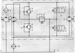 1-雙向變量柱塞泵;2-雙向定量馬達(dá);3-低壓齒輪泵;4-過濾器;5-單向閥 6-補(bǔ)油溢流閥;7-油箱;8-溢流閥;9-中位閥;10-冷卻器.