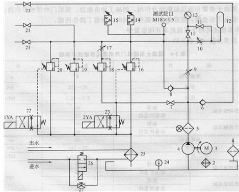 1-通氣過濾器;2-加熱器, 3-雙速電動機(jī)14定量液壓泵;5帶樗染指示精過濾器; 6、8單向閥;7、11、21截止閥,9、10、17 -節(jié)流周;12蓄能器;13壓力表; 14、15壓力繼電器;16、20先導(dǎo)式溢流閥l 18、19 -溢流閥;22、23二位四通電磁換向閥;24電接觸式溫度計(jì);25水冷卻器;26二位二通電磁水閥;27水截止閥
