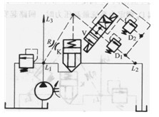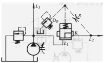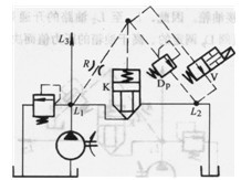 圖3 .4-17中插裝閥K的液阻橋路在L1、L2間形成順序回路。插裝閥K的L2端連向液壓系統(tǒng)的一個(gè)用油點(diǎn),而不是接油箱。橋臂上的先導(dǎo)溢流閥Dp接油箱。因此,Li至L2油路的開通是由先導(dǎo)溢流閥Dp調(diào)定的、高于油箱的壓力值而決定的。