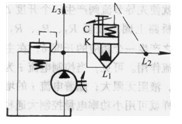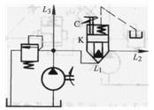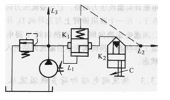 圖3. 4-11中插裝閥K在L1、L2間形成節(jié)流回路。插裝閥處于常開狀態(tài)。此類插裝閥帶有節(jié)流錐,調(diào)節(jié)限位螺栓C就可調(diào)節(jié)插裝閥的開啟量,從而調(diào)節(jié)回路的節(jié)流量。