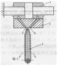 圖6-41所示為射流管裝置的工作原理。它由射流管3、接受板2和液壓缸1組成。射流管3可繞垂直于圖面的軸線左右擺動(dòng)一個(gè)不大的角度。接受板2上有兩個(gè)并列著的接受孔道
