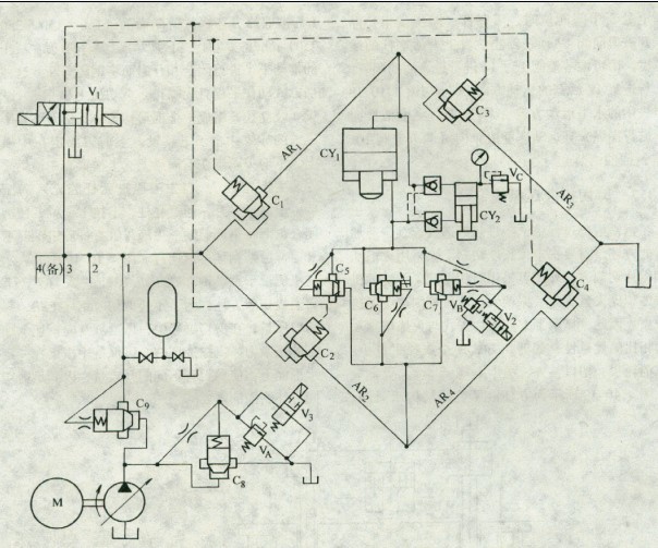 圖3所示為剪切機(jī)的液壓系統(tǒng)。插裝閥C1、C2、C3、C4分別為4個(gè)液阻橋臂AR1、AR2、AR3、AR4上的主開(kāi)關(guān)閥。當(dāng)AR1、AR4橋臂通導(dǎo),AR2、AR3橋臂截止時(shí)主液壓缸cy1和壓緊缸cy2的活塞桿向下,完成剪刃閉合動(dòng)作。當(dāng)AR2、AR3橋臂通導(dǎo),AR1、AR4橋臂截止時(shí),主液壓缸和壓緊缸活塞桿向上收縮,剪刃開(kāi)啟,電磁換向閥V1控制4個(gè)橋臂上插裝閥的開(kāi)、關(guān)。在液阻橋路的中路上,插裝閥C5和C6組成向下的單向截流回路,其作用是使剪刃慢速接近鋼坯,防止沖擊。插裝閥C7與閥V2、VB組成開(kāi)、關(guān)及溢流回路,其作用可使剪刃快降以及保護(hù)主液壓缸無(wú)桿腔的超壓。壓緊缸上腔的溢流閥Vc用以調(diào)定壓緊力。插裝閥C8及V3、VA組成電控溢流回路。C9為單向閥。由于液壓剪所需流量大,采用4個(gè)手動(dòng)變量柱塞泵,3臺(tái)工作1臺(tái)備用。
