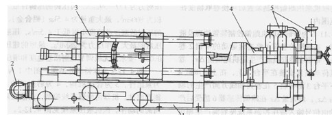 圖1為壓鑄機外型圖,圖中l(wèi)為床身,2為泵組件,3為合型機構(gòu),4為后射機構(gòu),5為高能器組件。機器由電器系統(tǒng)控制,由液壓系統(tǒng)完成所需的動作。該機液壓系統(tǒng)見圖4.12-2。臺型缸1運動進行合型,為了使較小的合型缸產(chǎn)生很大的合型推力,采用曲拐連桿擴力機構(gòu)。合型過程是先低壓驅(qū)動以保護壓鑄型,再進行高壓閉鎖。當(dāng)合型到位后,插入型芯,此后一定量的金屬液澆人壓射室中,然后壓射缸2動作進行壓射,為了減少空氣的卷入,壓射開始階段用較低的速度,當(dāng)金屬液完全充滿壓射室及橫澆道時,立即高速壓射以得到表面清晰的鑄件。為了得到致密的鑄件,在金屬液完全充滿型腔的瞬間,增壓器3立即作用,使金屬液馬上處于高壓下進行凝固,此種高壓一直保持到規(guī)定的冷卻時間。這時進行開型動作,壓射頭同時跟出(如果開型前要先抽出型芯,則抽芯缸4或24動作,抽芯后才能開型),開型到位后,頂出缸5推動頂出板將鑄件由壓鑄型頂出。壓射活塞回程,頂出缸返回,開始準(zhǔn)備下次工作循環(huán)。為了保證鑄件質(zhì)量,蓄能器30的壓力必須達到規(guī)定值后,才允許進行壓射動作。另外,根據(jù)零件的結(jié)構(gòu),可采用多種插芯和抽芯程序,即先插芯后臺型或先合型后插芯,而抽芯與開型的順序則與插芯合型相反,機器的電器系統(tǒng)已備好程序選擇。