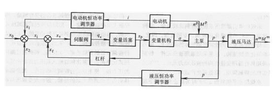 液壓恒功率調(diào)節(jié)器17由裝在開(kāi)關(guān)活塞16中的一個(gè)小柱塞17.1和平衡彈簧17.2構(gòu)成。小柱塞一端與系統(tǒng)的高壓側(cè)相通,所受的液壓力與彈簧力始終相平衡。故小柱塞的伸出距離x1與系統(tǒng)的液壓力成正比,它實(shí)際上就是系統(tǒng)的壓力反饋測(cè)量裝置;電動(dòng)機(jī)恒功率調(diào)節(jié)器18包括一個(gè)行程可調(diào)的小活塞和一個(gè)三位四通電磁閥18.2。這兩個(gè)調(diào)節(jié)器的柱塞軸線和油塞軸線在同一直線上,并與主泵的零位相對(duì)應(yīng)。電磁閥18.1由電流反饋系統(tǒng)測(cè)得的電流信號(hào)控制,是一個(gè)具有死區(qū)的繼電器型非線性控制環(huán)節(jié)。小活塞的外伸距離為z:。此系統(tǒng)主要環(huán)節(jié)的方框圖如圖4.8-6所示。圖中xo為給定位移,x1為液壓恒功率調(diào)節(jié)器的位移,X2為電機(jī)恒功率調(diào)節(jié)器的位移,xi=xo-x1-x2,xf為反饋杠桿位移,xv= xi -xf,qv為伺服閥流量,xp為變量活塞位移,α為變量機(jī)構(gòu)轉(zhuǎn)角,np、Mp為泵輸入的轉(zhuǎn)速和力矩,p、q為泵輸出的壓力和流量,nm、Mm為液壓馬達(dá)輸出的轉(zhuǎn)速和力矩,i為電動(dòng)機(jī)恒功率調(diào)節(jié)器的控制電流。