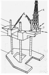 a)鉆井平臺(tái)外觀簡(jiǎn)圖 1-沉墊2-直升飛機(jī)平臺(tái)3-升降室4-直升飛機(jī)平臺(tái)5-樁腿6-鉆機(jī)井架7-井架底座 液壓系統(tǒng)按鉆井工藝要求分以下幾個(gè)回路: