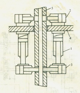 在圖4.9-3b中,缸體l與平臺(tái)4固結(jié),缸體2也和平臺(tái)固結(jié)。缸體3和缸體1活塞桿的一端固結(jié)。樁腿5降人海底的動(dòng)作是:缸體2活塞桿自樁腿5徑向孔中退出(松開(kāi)),缸體3活塞桿進(jìn)入樁腿徑向孔中(鎖緊),缸體1的活塞桿帶動(dòng)樁腿下行,然后缸體2鎖緊,缸體3松開(kāi),缸體1的活塞復(fù)位。如此循環(huán),直到樁腿接觸海底。反之,可使平臺(tái)沿樁腿上升離開(kāi)海面,到達(dá)一定的高度后,缸體2和3同時(shí)鎖緊,平臺(tái)可投入正常作業(yè)。