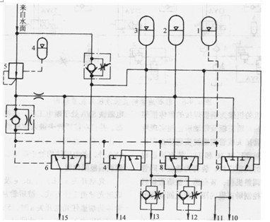 1、2、3、4-蓄能器 5-調壓減壓閥 6、7、8、9-液控換向閥