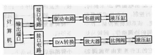 林木球果采集機(jī)器人屬示教再現(xiàn)型機(jī)器人。它的移動(dòng)機(jī)構(gòu)采用J-50拖拉機(jī)。它的機(jī)械手為5個(gè)自由度全液壓驅(qū)動(dòng)的機(jī)械手,由計(jì)算機(jī)與電液比例調(diào)速閥進(jìn)行電液比例控制。機(jī)械手電液比例控制系統(tǒng)工作原理如圖4.2-8所示。