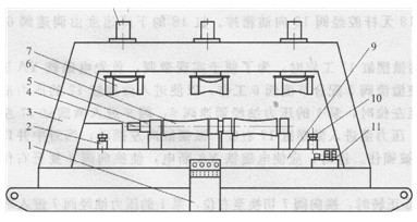 1-電控柜;2一左沖頭, 3-機架;4-液壓馬達;5一減速器;6一下輥系 7上輥系; 8液壓缸;9工作臺;10右沖頭;11一液壓閥組