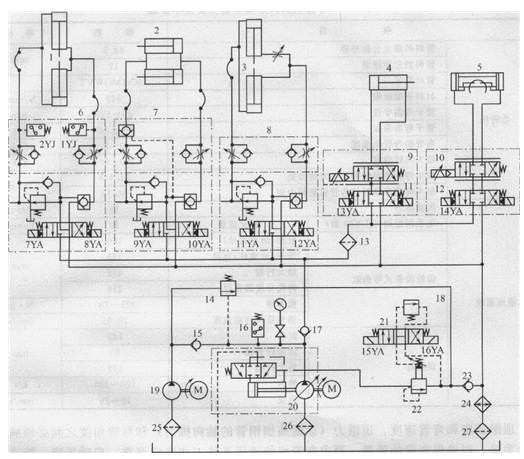 1-頂鐓央緊液壓缸;2-收緊液壓缸;3-彎管模液壓缸;4一頂鐓液壓缸; 5-齒輪齒條式彎曲液壓缸;6、7、8缸1、2、3的液壓閥油路;9、10電赦伺服閥; 11、12三位四通電液換向閥;13、25、26、27過濾器;14-遠(yuǎn)控順序閥; 15、17、23-單向閥;16-壓力繼電器;18-遠(yuǎn)程調(diào)壓溢流閥;19-定量液壓泵;