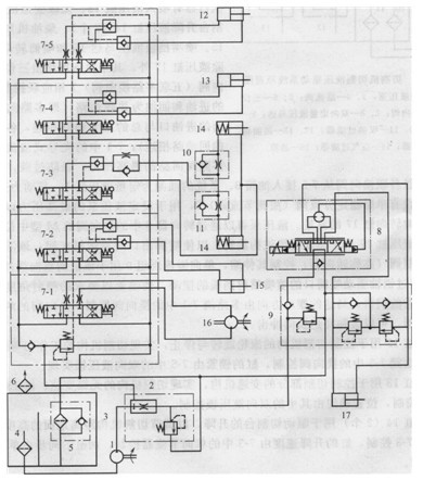 1)液壓控制系統(tǒng)(見(jiàn)圖1) 控制系統(tǒng)的執(zhí)行器有喂入液壓缸12、無(wú)級(jí)變速液壓缸13、切割臺(tái)升降液壓缸14(2個(gè))、柴油機(jī)離合器液壓缸15、噴嘴擋板液壓馬達(dá)16和噴筒轉(zhuǎn)向液壓缸17。除液壓缸17外,其余執(zhí)行器均由三位六通手動(dòng)換向閥(五聯(lián)多路換向閥)7相應(yīng)聯(lián)控制。多路閥7的進(jìn)油和回油為并聯(lián)油路(即多路閥中各聯(lián)換向閥的進(jìn)油口與總的壓力油路相連,各回油口與總的回油路相連);7-1中的先導(dǎo)式溢流閥用于設(shè)定多路閥回路的最高壓力,以防過(guò)載,溢流閥的遙控口串聯(lián)經(jīng)各聯(lián)換向閥從7-5接入油箱3。系統(tǒng)的油源為定量液壓泵1,其動(dòng)力來(lái)自柴油機(jī)。泵的出口設(shè)有單路穩(wěn)定分流閥(溢流節(jié)流閥)2,用于設(shè)定液壓泵的最高壓力以防系統(tǒng)過(guò)載并穩(wěn)定通向轉(zhuǎn)向缸17的流量。液壓泵可以通過(guò)轉(zhuǎn)向器8中的換向閥的M型中位卸荷。