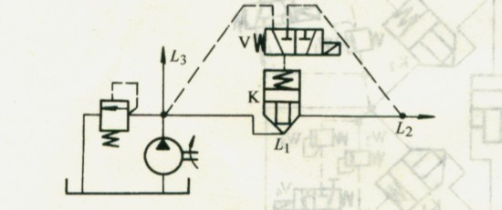 圖3.4-6中先導(dǎo)電磁換向閥V得電后插裝閥K開啟,油液由L,流向L2,當(dāng)先導(dǎo)電磁換向閥V失電后插裝閥K關(guān)閉。由于在控制油路中液阻R1、R2的作用而使插裝閥延時開啟和關(guān)閉,從而減少油路開、關(guān)時的沖擊。
