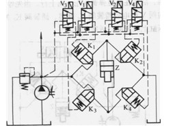 一般而言,由于液壓油缸(廣義而言為任何液壓驅(qū)動的執(zhí)行器)要完成往復(fù)運動,主油路液阻橋路4個橋臂上的4個插裝閥K1、K2、K3、K4是必不可少的。然而,執(zhí)行器往往不只要求簡單的往復(fù)運動,而是有時在某一運動方向上有位置、速度、力運動參數(shù)等方面的要求。這只要在4個橋臂,4個主插裝閥為主的基礎(chǔ)上就可較容易地組成復(fù)合回路。反之,如果有一個復(fù)雜的插裝閥液壓系統(tǒng),一時難以理解,而用液阻橋路的分析方法,就會使系統(tǒng)一目了然。圖4 .12 -12快鍛機液壓系統(tǒng)就是用液阻橋路方法分析四通換向復(fù)合回路的一個例子。