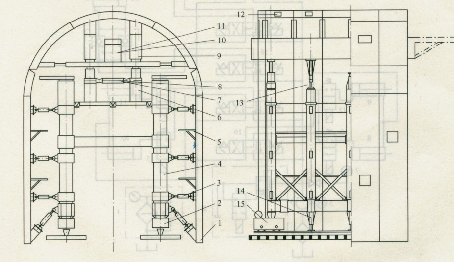 3)水平液壓缸的操作兩個水平液壓缸35和36由三位四通電磁換向閥18和19的控制,可同時動作,也可單獨動作,完成模板相對龍門架左、右平動,從而實現模板中心與隧道中心的對位。
