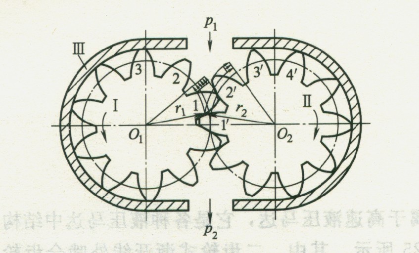 ①工作原理圖1所示為二齒輪式漸開線外嚙合齒輪液壓馬達(dá)工作原理,兩個相互嚙合的齒輪工、Ⅱ的中心為01和02,嚙合點(diǎn)半徑為ri和r2。齒輪I為帶有負(fù)載的輸出軸。當(dāng)高壓油液p1(P2為回油壓力)進(jìn)入齒輪馬達(dá)的進(jìn)油腔(由齒1、2、3和1’、2’、3’、4’的表面及殼體和端蓋的有關(guān)內(nèi)表面組成)之后,由于嚙合點(diǎn)的半徑小于齒頂圓半徑,故在齒1和2’的齒面上便產(chǎn)生如箭頭所示的不平衡液壓力。該液壓力對于軸線O1和02產(chǎn)生轉(zhuǎn)矩。在該轉(zhuǎn)矩的作用下,齒輪馬達(dá)按圖示方向連續(xù)地旋轉(zhuǎn)。隨著齒輪的旋轉(zhuǎn),油液被帶到回油腔排出。只要連續(xù)不斷向齒輪馬達(dá)提供壓力油,液壓馬達(dá)就連續(xù)旋轉(zhuǎn),輸出轉(zhuǎn)矩和轉(zhuǎn)速。齒輪液壓馬達(dá)在轉(zhuǎn)動過程中,由于嚙合點(diǎn)不斷改變位置,故液壓馬達(dá)的輸出轉(zhuǎn)矩是脈動的。