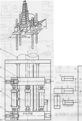 自升式海洋石油鉆井平臺(tái)用于海洋石油鉆井。圖4-1所示為采用液壓缸驅(qū)動(dòng)的插銷爬桿式樁腿插拔和平臺(tái)升降的樁基裝置結(jié)構(gòu)示意圖。一根樁基上的4個(gè)同步升降運(yùn)動(dòng)的主液壓缸4與平臺(tái)的可升降的上環(huán)梁2與固定的下環(huán)梁5剛性連接。當(dāng)平臺(tái)浮在海面上時(shí),如果先使上插銷液壓缸3拔上插銷B,再使主液壓缸4的活塞桿外伸一個(gè)行程(節(jié)距,從B到A),接著上插銷缸3把上插銷插入樁腿的銷孔A中,上、下插銷換手后,由下插銷液壓缸6拔出下插銷c,然后使主缸4活塞桿帶動(dòng)樁腿1縮進(jìn)一個(gè)節(jié)距(從A到B),則樁腿就下降了一個(gè)節(jié)距;如果樁腿l已插至海底第二個(gè)承力層,重復(fù)上述過程則平臺(tái)就上升了一個(gè)節(jié)距。反之,也可使平臺(tái)下降或拔樁。