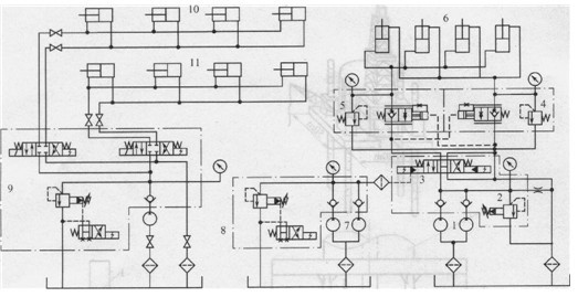 1-主回路雙定量液壓泵;2-溢流閥; 3-三位四通電液換向閥;4、5一限速、鎖緊閥組; 6-主液壓缸;7-控制回路雙定量液壓泵;8-控制閥組;9-插銷回路控制閥組; 10-上插銷液壓缸; 11-下插銷液壓缸