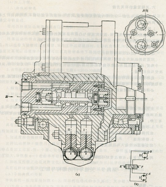 圖1為兩排柱塞串、并聯(lián)。變量的馬達(dá)。它有大小相同的I、Ⅱ兩排柱塞。配流裝置由配流軸1和液控變速閥(亦稱串、并聯(lián)閥)2組成。配流軸上相應(yīng)于每排柱塞油腔的位置上,有兩排油孔e、f,每排油孔交叉均勻地分成兩組,這樣兩排油孔就分成四組,分別與軸內(nèi)的環(huán)槽a、b、c、d相通。通過(guò)變速閥2移動(dòng)位置來(lái)實(shí)現(xiàn)I、Ⅱ兩排柱塞并聯(lián)工作(低速工況)或串聯(lián)工作(高速工況),達(dá)到兩級(jí)變速目的。由變速原理圖1(b)可見(jiàn),當(dāng)變速閥處于圖示位置時(shí),假定A口通高壓、B口通回油。高壓油經(jīng)變速閥的中心孔到達(dá)環(huán)槽a,可以進(jìn)入I排柱塞油腔,其回油經(jīng)g孔、環(huán)槽b進(jìn)入環(huán)槽c,再經(jīng)h孔進(jìn)入Ⅱ排柱塞油腔,其回油經(jīng)環(huán)槽d至B口回油箱。顯然,兩排柱塞串聯(lián)工作,此時(shí)為高速小扭矩。若變速閥右移,則a、c兩環(huán)槽被溝通,b、d也被溝通,因此從A孔來(lái)的高壓油同時(shí)進(jìn)入I、Ⅱ兩排柱塞油腔,而b、d兩環(huán)槽同經(jīng)B孔回油,此時(shí)兩排柱塞并聯(lián)工作,得到低速大扭矩。若變速閥左移,a、b、c、d四環(huán)槽同時(shí)接通,馬達(dá)內(nèi)部循環(huán),不產(chǎn)生扭矩而自由旋轉(zhuǎn)。