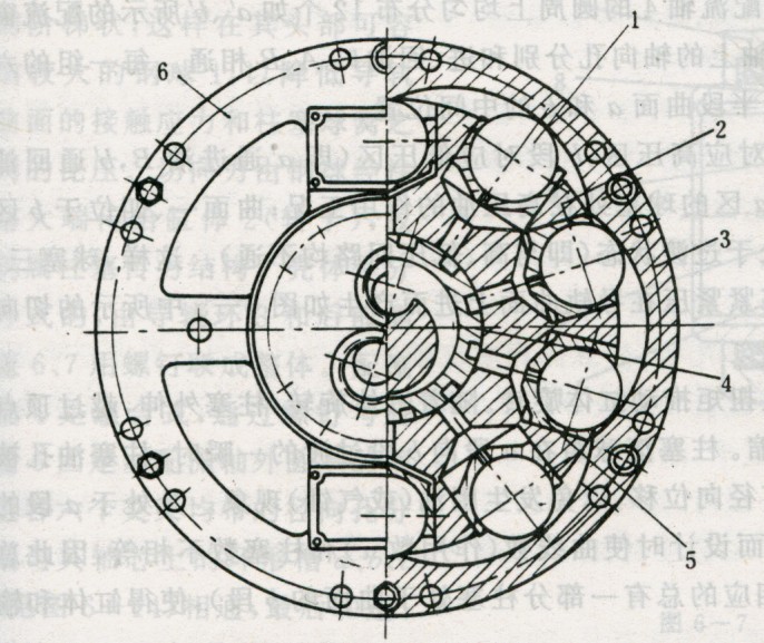 它由轉(zhuǎn)子缸體2、導(dǎo)軌3和柱塞5-鋼球1組成的球塞副、配流軸.4、外殼6等組成。圖1為具有10球塞六作用次數(shù)的馬達(dá)。所謂作用次數(shù)z,即每個(gè)球塞隨轉(zhuǎn)子轉(zhuǎn)一轉(zhuǎn)往復(fù)的次數(shù),也即導(dǎo)軌所具有的曲線凹凸數(shù)。配流軸4的作用是依次將高壓油分配給各球塞,并將低壓油從各球塞依次通過配流軸排出。柱塞5在高壓油推動(dòng)下,帶動(dòng)鋼球1沿徑向向外運(yùn)動(dòng),與曲線導(dǎo)軌3接觸,鋼球1與導(dǎo)軌曲線的相互作用如圖6-5所示。柱塞副所產(chǎn)生的液壓力P是沿柱塞軸線的。該力分為兩個(gè)力Ⅳ與F,Ⅳ力與導(dǎo)軌曲線相垂直,并與導(dǎo)軌曲線的反力相平衡。分力F即為推動(dòng)缸體旋轉(zhuǎn)的切向力。切向力F與向徑P(P為滾輪中心至馬達(dá)旋轉(zhuǎn)中心的距離)的乘積即為該球塞所產(chǎn)生的扭矩。各作功柱塞產(chǎn)生的扭矩之和即為液壓馬達(dá)在該瞬時(shí)的輸出扭矩。 為便于讀者進(jìn)一步了解,現(xiàn)以六作用八球塞的馬達(dá)導(dǎo)軌展。