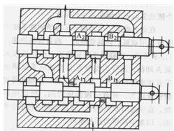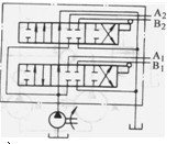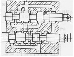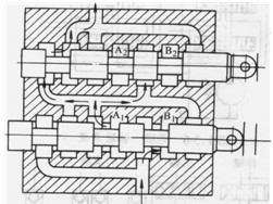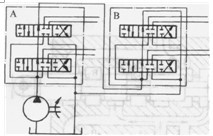 復(fù)聯(lián)系統(tǒng)是以上三種系統(tǒng)的組合,如并聯(lián)一獨(dú)聯(lián)、串聯(lián)一獨(dú)聯(lián)、串聯(lián)一并聯(lián)等系統(tǒng)。圖1. 3-6為并聯(lián)一獨(dú)聯(lián)系統(tǒng)。多路閥A控制一部分并聯(lián)的液壓執(zhí)行機(jī)構(gòu)。多路閥B則控制另一部分并聯(lián)的液壓執(zhí)行機(jī)構(gòu)。但兩個(gè)多路閥所控制的執(zhí)行機(jī)構(gòu)之間是相互獨(dú)立的。所以在B閥操縱的執(zhí)行機(jī)構(gòu)動(dòng)作時(shí),即使誤操作A閥,也不會(huì)使A閥控制的執(zhí)行機(jī)構(gòu)誤動(dòng)作。