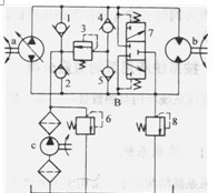 在發(fā)熱量較大的閉式系統(tǒng)中,為改善系統(tǒng)的散熱情況,需增加補(bǔ)油量,故增設(shè)低壓選擇閥(圖1. 3-2中的閥7),使系統(tǒng)經(jīng)常有部分低壓油經(jīng)閥7排回油箱。但此時(shí)輔助泵c的流量應(yīng)是主泵a的流量的20%~30%。