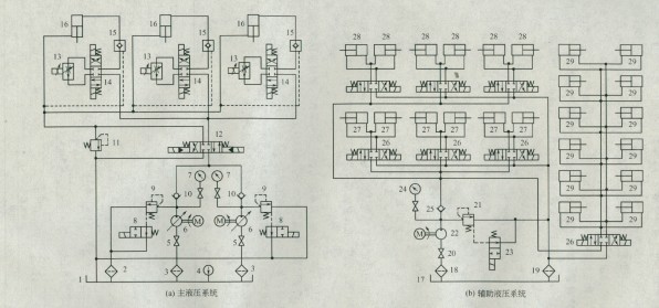 圖3-10 (b)所示為輔助液壓系統(tǒng),它由單定量泵22供油,泵的壓力和卸荷由溢流閥21和二位二通電磁換向閥23控制,系統(tǒng)壓力由壓力表及其開關(guān)24顯示;3組(6個(gè))并聯(lián)的上插銷液壓缸、3組(6個(gè))并聯(lián)的下插銷液壓缸和6組(12個(gè))液壓缸的往復(fù)運(yùn)動(dòng)由各三位四通電磁換向閥26控制。