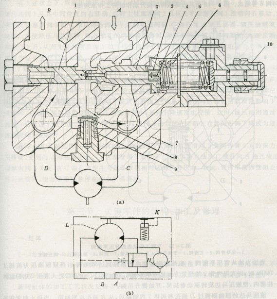 1-先導(dǎo)滑閥;2-主滑閥;3-節(jié)流孔板;4、5、6、9-彈簧,7-閥體;8-單向閥,10-調(diào)壓螺蓋